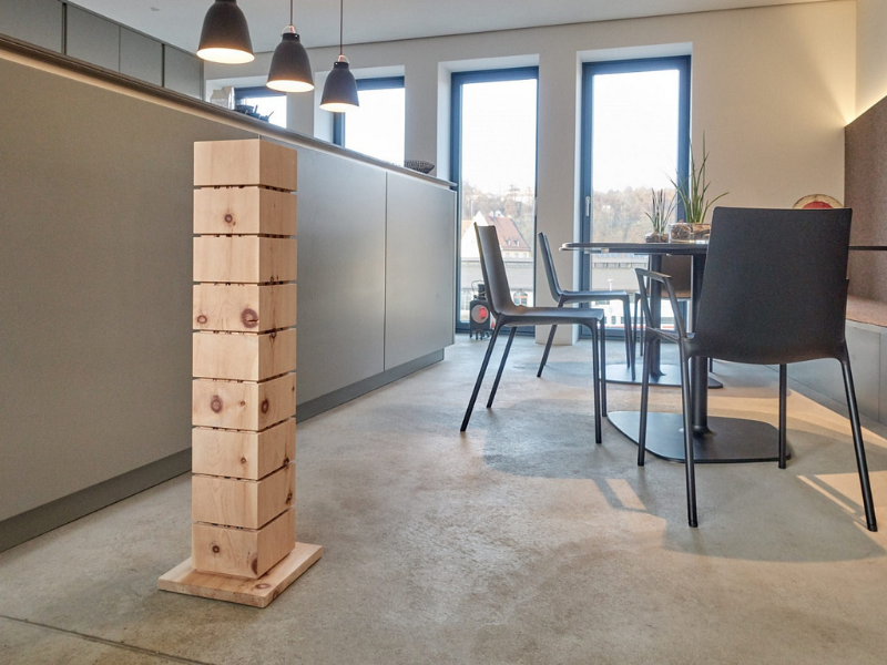 Als gelungenes Dekorationsobjekt fungiert die Zirbensäule, die der Erfrischung der Raumluft dient. So wurde eine formal modernere Variante entworfen, die als Alternative zu traditionellen Modellen gilt.