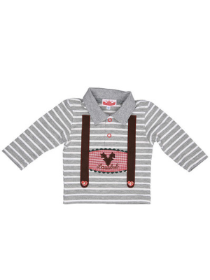 Bei diesem zünftigen grau-weiß-gestreiften Langarm-Shirt aus 100% Baumwolle werden die kleinen Lausbuben besonders viel zu lachen haben. Denn es bietet doch mit Liegekragen und Druckknopfleiste einen besonders hohen Tragekomfort. Ein Hirschkopf und der Schriftzug „Lausbub“ auf dem Latz sowie aufgestickte rote Herzen mit Edelweiß an den Trägern vervollständigen den stimmigen Gesamteindruck noch. Wir glauben, der Lausbub von heute kommt an diesem Shirt nicht vorbei!