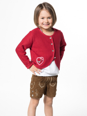 Sie punktet auch noch mit einer Herzerltasche, die mit einem karierten Rand umrandet sowie mit einer kleinen Kette mit Herz geschmückt wurde. Ganz bezaubernd wird es, wenn diese Strickjacke zu den Kids-Dirndln von Spieth & Wensky getragen wird!