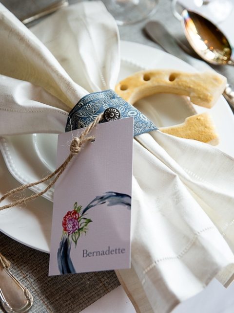 Die Braut-Tafel wurde von der Floristin mit einer prächtigen Blumengirlande geschmückt. Die Servietten waren mit bayrischen Bändern umwickelt und an den echten Dirndlknöpfen wurden die Platzkärtchen befestigt.