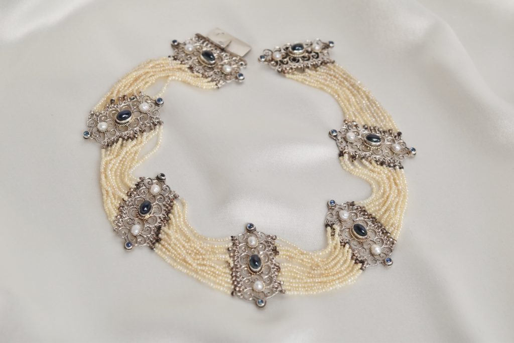 Von ca. 1950 hingegen stammt dieses bezaubernde Trachtencollier aus Silber, das mit Granaten und Zuchtperlen verziert ist. Es legt sich mit seinen Girlandenmotiven perfekt ins Dekolleté und passt mit seinen Zuchtperlen sehr gut zu exquisiten cremefarbenen Stoffen.