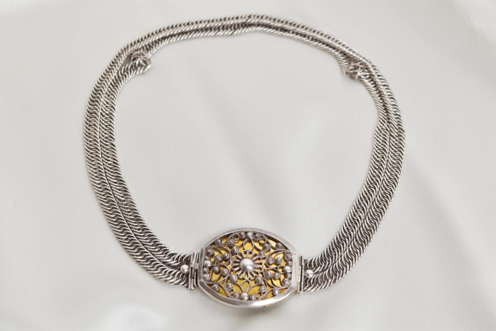Wer es schlichter mag, für den ist diese zurückhaltende Kropfkette aus der Zeit des Biedermeier die passende Ergänzung. Die Schließe mit feinem filigranen Kordeldrahtdekor über vergoldetem Grund wirkt kostbar und anmutig zugleich.