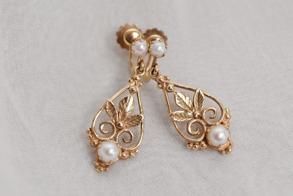 Ebenfalls an feine Spitze erinnern diese zauberhaften Ohrringe, die florale, zart durchbrochene Motive haben und mit kleinen Perlen besetzt sind. Sie entstanden um 1910 und sind einfach eine wunderschöne Ergänzung zum bräutlichen Outfit.