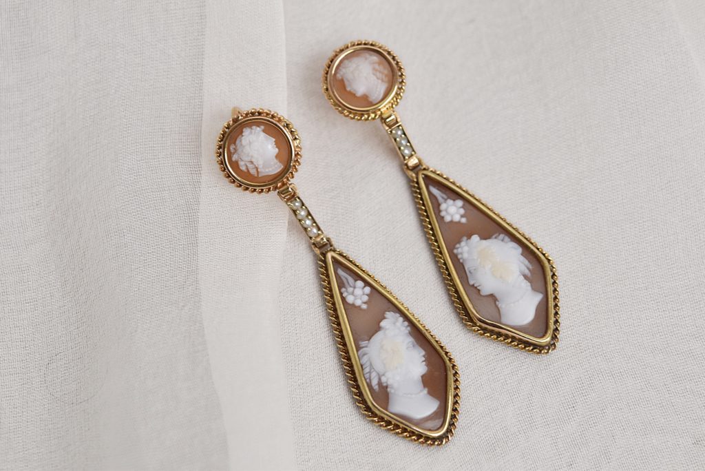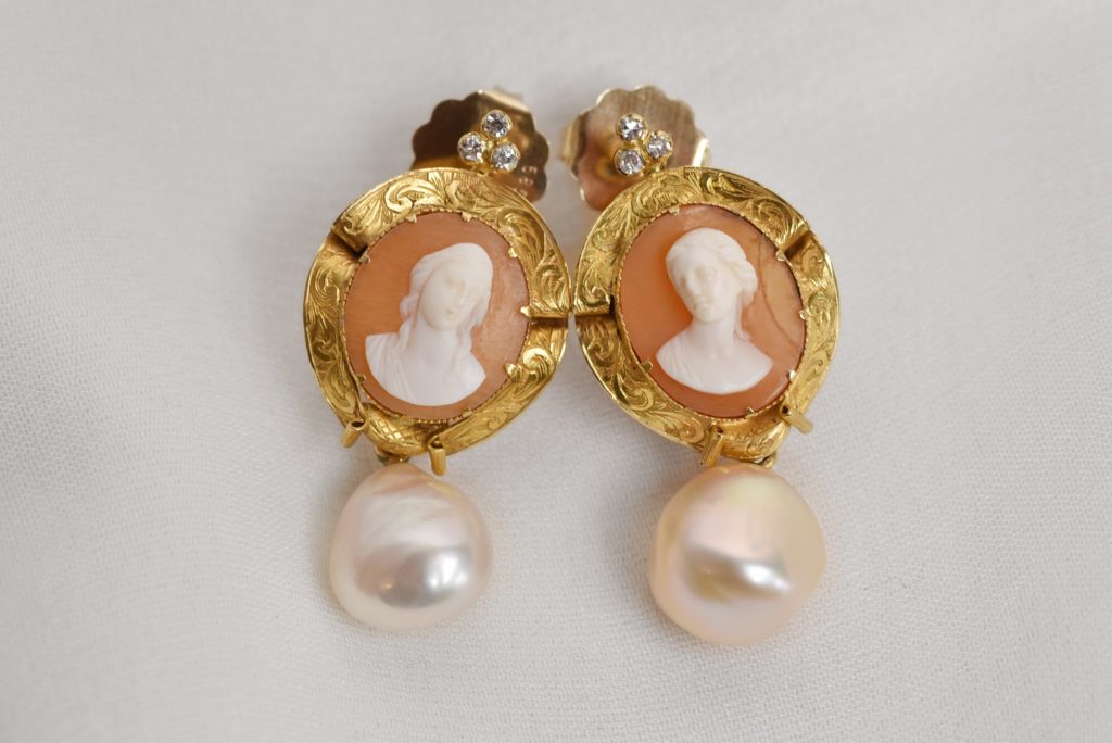 Ähnlich kostbar sind diese Kamee-Ohrringe, die mit Diamanten besetzt sind und als hängenden Abschluss je eine barocke Zuchtperle haben. Sie stammen von ca. 1880 und bilden mit ihrem ziselierten Goldrand zu Spitzenblusen ein edles, unvergessliches Ensemble.