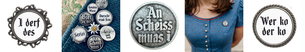 Neben Ansteckern mit bayerischen Sprüchen wie Bazi, Zefix oder Durscht wiad Sau, gibt es auch eine eigene Linie für Wien bzw. Österreich mit Ned hudln, Leiwand und Oida. Lieblingsmenschen können mit Beste Mama, Beste Oma, Bester Onkel bedacht werden und für die Schwaben steht beispielsweise Grasdaggl, Heiligs Blechle oder Koi Zeit zur Auswahl.