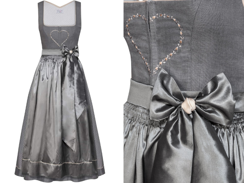 Jetzt bezaubert uns „Luisa“, das lange Dirndl mit einer Seidenschürze aus dem Hause Giacomelli in Silbergrau. Dieses, exklusiv für Lodenfrey designte Dirndl, wurde, übrigens wie alle Modelle von Giacomelli, im hauseigenen Atelier in Rottach-Egern gefertigt. Der Entwurf besticht nicht nur durch das edle Leinen-Mieder, sondern setzt auch Akzente durch die Seidenschürze mit zwei-farbigem Band und den femininen, gereihten Rock mit feinem Punkte-Design.