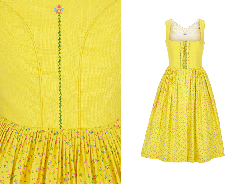 Verspielt und dezent zugleich, das ist „Nani“. Das unifarbene Mieder aus feinem Leinen, mit einer aufregenden Rückenstickerei ausgestattet, bietet dabei einen ruhigen Kontrast zum femininen Blumen-Muster auf dem Rock.