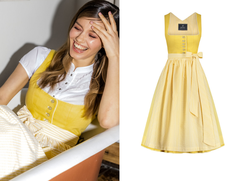 Harmonisch wird ein Akzent durch die gelb gestreifte Dirndlschürze aus Seersucker gesetzt. „Luna“ sieht sich als ein tolles, leichtes Frühlingsdirndl, das zu jedem Anlass passt, egal ob Waldfest oder Wiesn.