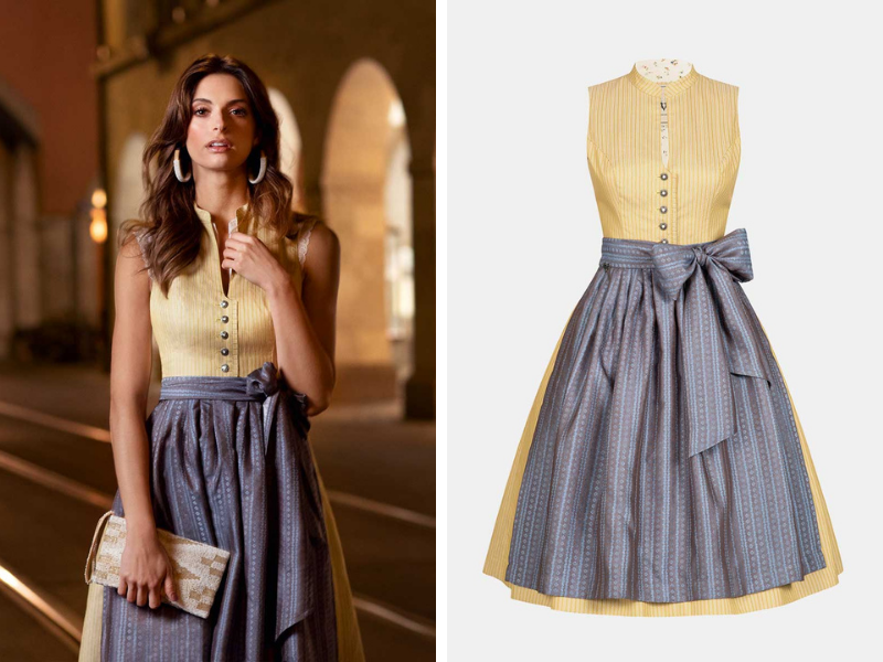 Das Mieder sowie der Rock wurden farblich in einem knalligen Vanille-Gelb mit klassischer Trachtenmusterung gestaltet. Dazu setzt sich die Schürze in einem kühleren Grau ab, während ihr dezenter Blumendruck in leichtem Himmelblau erscheint. Aber auch ein sehr praktisches Detail macht noch auf sich aufmerksam: Das Dirndl kann sowohl mit als auch ohne Bluse getragen werden.