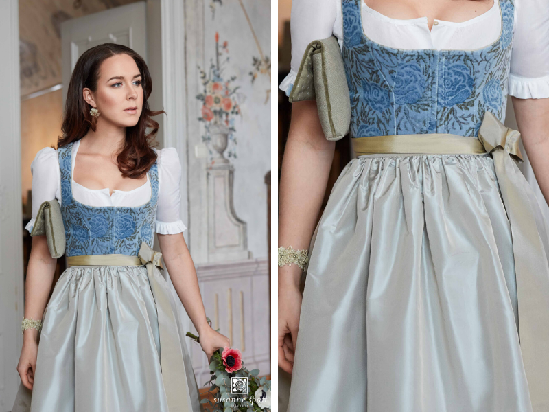 Ein Dirndl, das den Beweis antritt, dass helle Blau-Töne aus der blumigen Barockzeit sich nicht nur häufig in Freskenmalereien widerspiegeln, nein, auch dieses bezaubernde Dirndl zeigt sich in blauer Frische. Eine weiße Dirndlbluse und eine sandfarbene Seidenschürze ergänzen hier ein Outfit der Superlative – Exklusivität garantiert!