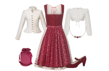 Dirndl Lena Hoschek €1.190 / Dirndlbluse Lena Hoschek €175 / Walkjanker Lena Hoschek €410 / Trachtenbeutel Chiemseer Dirndl & Tracht €39 / Pumps Der Schuhtrachtler* €89 / Kette Waidzeit €149