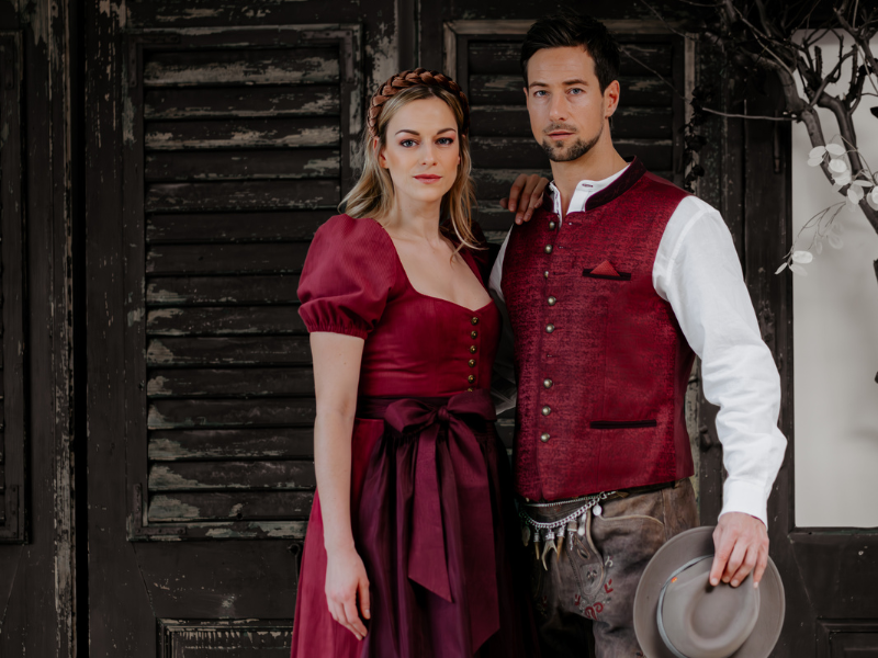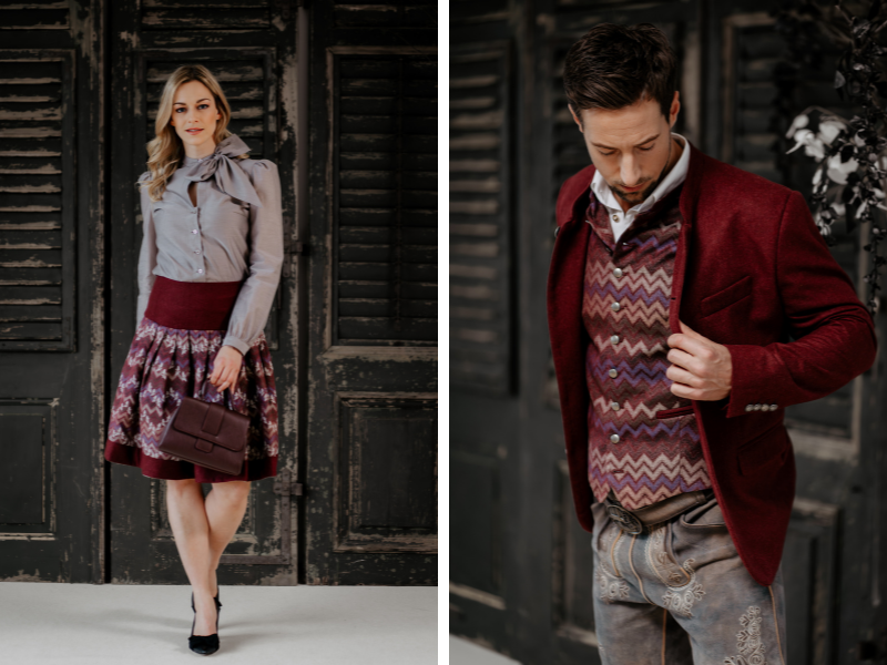 Beerenfarben bringen eine elegante Note in die Trachtenmode, ob als Hauptfarbe oder Akzent in Accessoires. Die Palette reicht von intensivem Rot bis hin zu tiefem Lila.