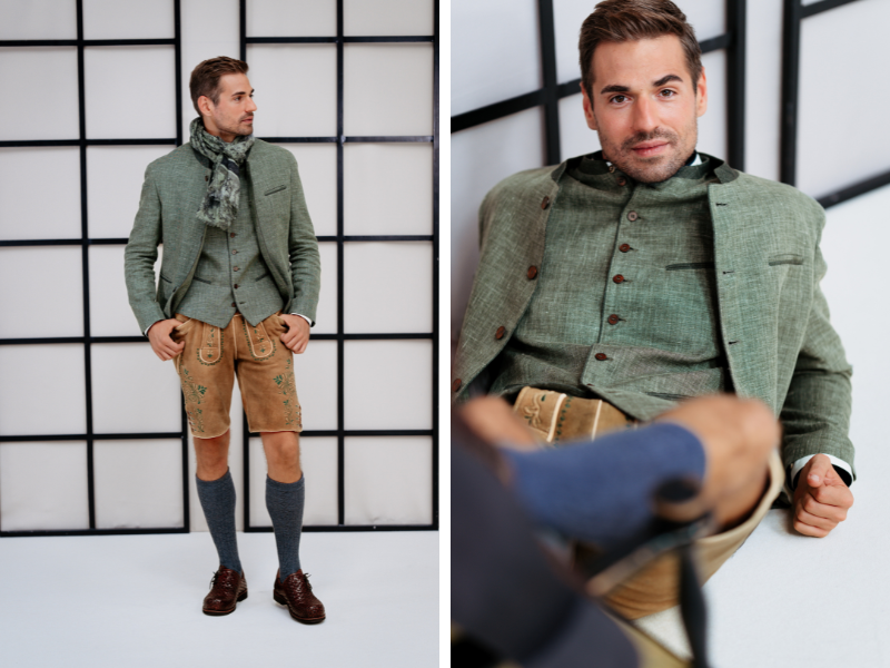 Lederhose, Janker und Gilet von G’weih & Silke, Schal von Luise Steiner, Strümpfe von Strumpf Dirks, Schuhe von Xaver Luis Schuhmanufaktur.
