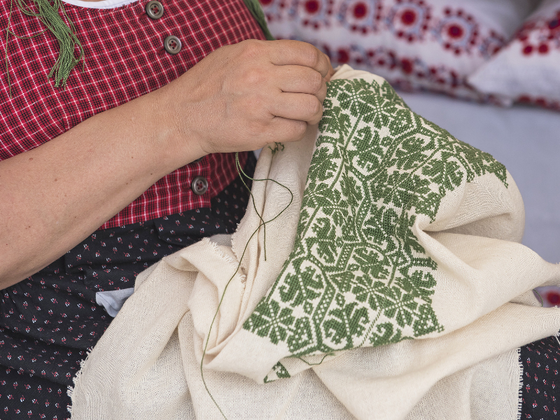 Die bewährten Bauernstoffe wurden traditionell auch im sogenannten Blaudruckverfahren mit floralen Motiven verschönert. Und auch die sehr beliebten aufgestickten Sinnsprüche auf weißem Leinengrund schafften es irgendwann einmal, dass man sie sich über das Sofa hängte, wo sie auch heute noch einen besonderen und traditionellen Blickfang darstellen.