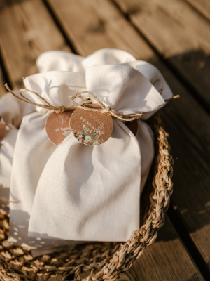 Mit einem schlichten Label aus der Hochzeitspapeterie verziert und einer Schnur verschlossen, waren kleine Beutel aus dem Stoff des Brautdirndls gefertigt und mit einem Kräuter-Gemüse-Blumen-Samen-Gemisch aus dem Hochzeitsgarten gefüllt worden – übrigens ein weiteres Upcycling-Produkt von Dagmar.