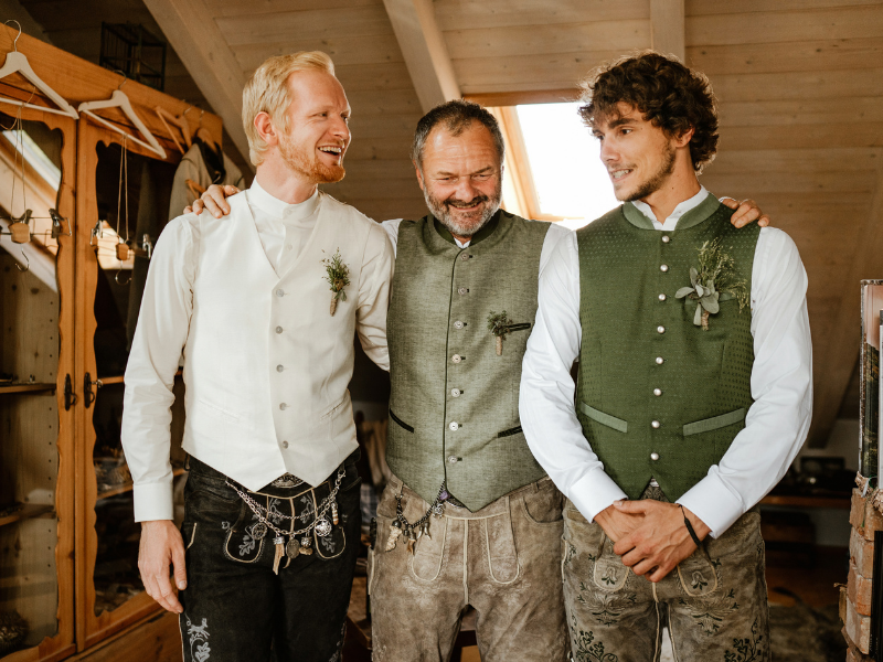 Natürlich von Natur aus attraktiv, bestand für Bräutigam Bastian, „best buddy“ Philipp und Bolko, den Hausherrn und Brautvater in spe, keine Notwendigkeit, noch kosmetische Register zu ziehen. Die Mannsbilder wurden professionell in Maß geschneiderte Outfits – natürlich Made in Bavaria! – gewandet.