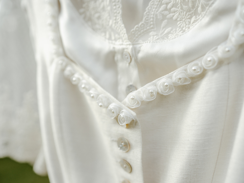 Das bezaubernde Brautdirndl, am Dekolleté dezent mit einer Tüllrosenborte und schimmernden Perlen verziert, überzeugte durch ein sehr feines, leicht glänzendes Leinen- & Seidenstoffgemisch in Offwhite.