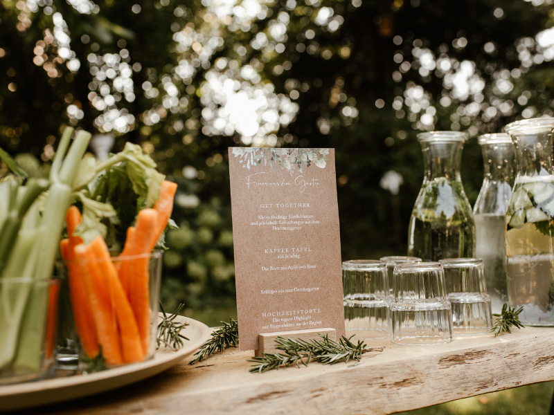 Die kleine Hochzeitsgesellschaft versammelte sich im Hochzeitsgarten – und dort warteten schon kleine fruchtige Leckereien und spritzige Erfrischungen. Von Dekorationsfee Dagmar die verschiedensten Kräuterlimonaden und eisgekühlten Beeren- und Apfel/Birnen-Smoothies hergestellt. Vegetarische und vegane Köstlichkeiten mit Dips ergänzten das Buffet.