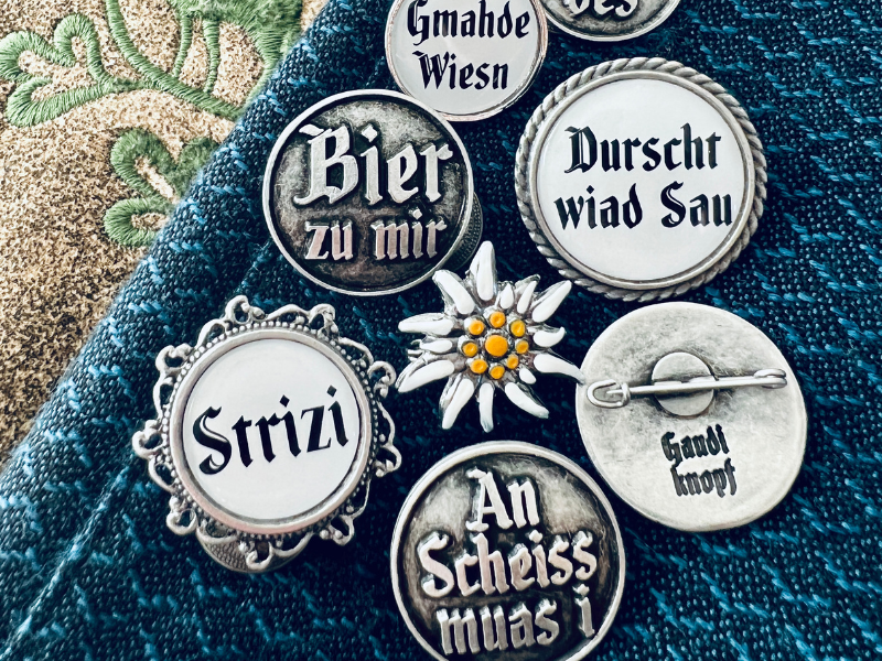 Egal, ob zum feschen Dirndl, zur Krachledernen oder modern zu Jeans & T-Shirt, mit einem Gaudiknopf wird immer die richtige Botschaft gesandt. Was darf’s denn sein?