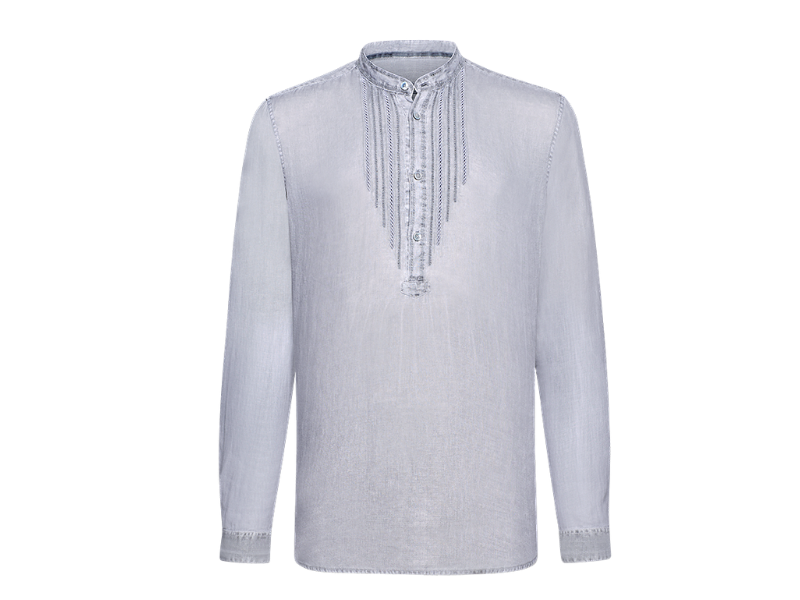 Dieses klassische weiße Leinenhemd mit einem Stehkragen wird gerne zur traditionellen Lederhose kombiniert. Allerdings sind auch die modischen Zeichen der Zeit nicht spurlos am Pfoad vorübergegangen.