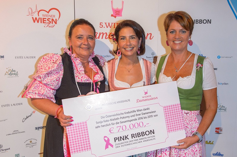 70.000 Euro – diese stolze Summe hat Damenwiesn-Gründerin Sonja Kato-Mailath-Pokorny für die Pink Ribbon Aktion der Österreichischen Krebshilfe gesammelt.