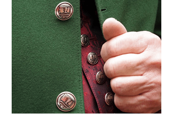 Im Gilet aus Reinseidenbrokat sind es die 12 Silberknöpfe, wie in Kärnten üblich, da diese für die 12 Haupttäler Kärntens stehen.