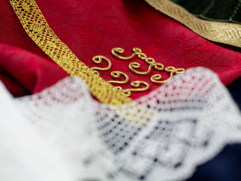 Der Brustlatz wiederum, aus rotem Loden gefertigt, ist mit Goldborten verziert und mit dem grünen Seidenband, wie das Mieder, umrandet.