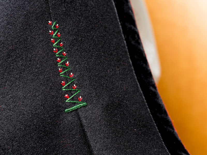 Am Halsausschnitt, an der vorderen Kante und am Ärmelsaum wird auch noch ein schwarzes Samtband aufgenäht. Geschlossen wird die Pustertaler Joppe mit handgearbeiteten Hafteln. Ein besonders hübsches Detail sind die handgestickten Lebensbäumchen an den vorderen und hinteren Abnähern.