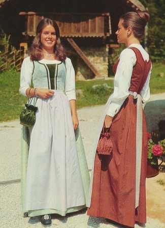 Die Grundfarben der Festtracht können von Grün, Blau über Rot und Braun reichen. Die Schürze ist schwarz, blau, violett oder grau, entweder unifarben oder gestreift.