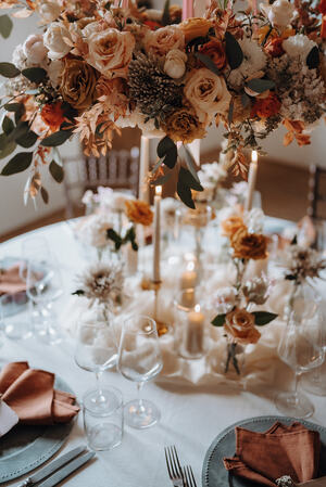 Die Tischdekoration wird hier mit sorgfältig ausgewählten Elementen vervollständigt. Ein Tischläufer, goldene Kerzenständer und rustikale Leinenservietten in Rost-Orange fügen sich harmonisch in das Gesamtbild ein und unterstreichen das Farbkonzept dieser Trachtenhochzeit.