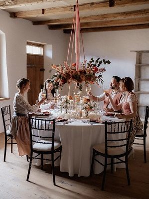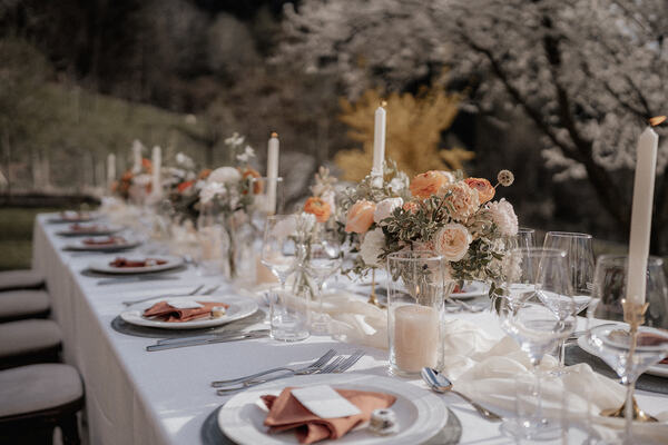 Eine lange Tafel vor dem Hof mit Blick ins Tal schafft eine malerische Atmosphäre und ermöglicht es den Gästen, die beeindruckende Landschaft zu genießen. Die natürliche Schönheit der Umgebung und die idyllische Berglandschaft verleihen der Hochzeit eine besondere Magie.